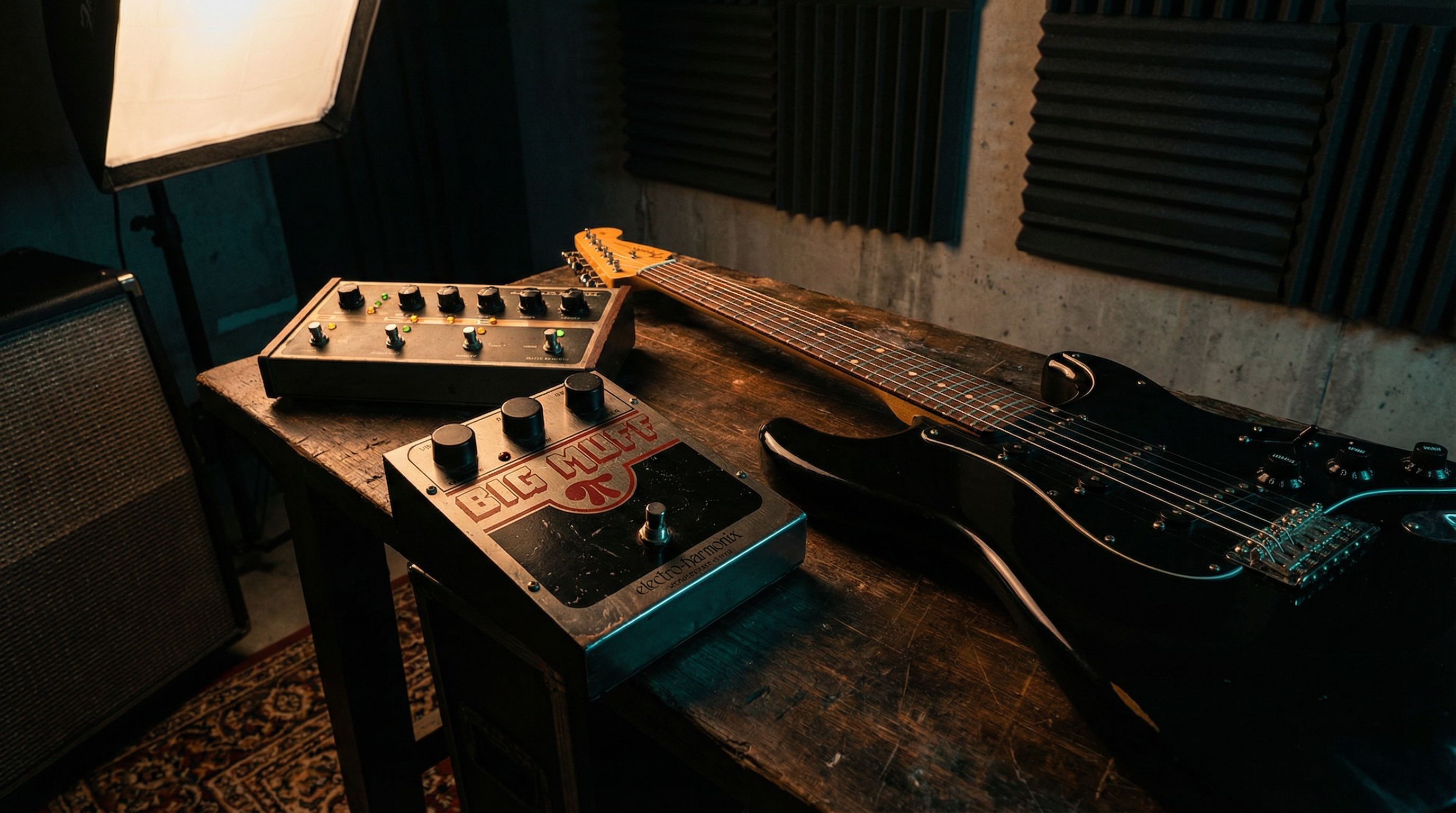 Big Muff variant: The Ram's Head Big Muff (the violet/maroon version from 1973–76) is closest to the studio tone. The NYC Reissue is the closest affordable equivalent. The Russian Big Muff has a slightly different character — more mid-forward, which isn't wrong here. The Nano Big Muff works in a pinch.